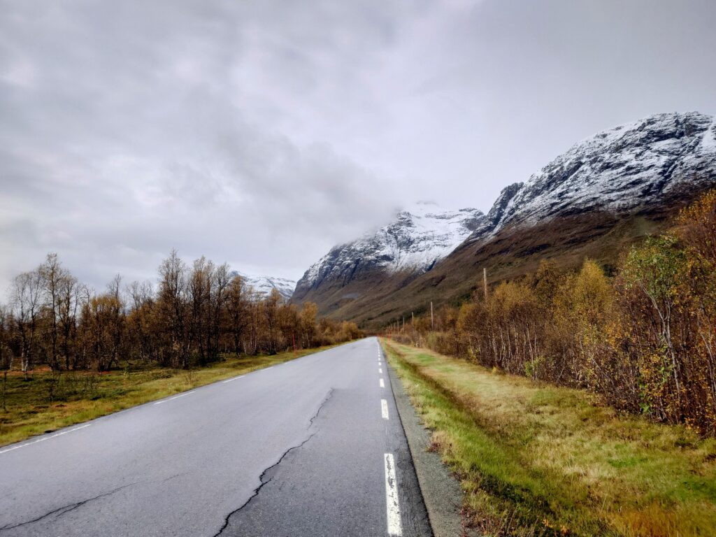 Keli oli muuttunut nyt aurinkoiseksi ja täydellä vatsalla oli kiva jatkaa matkaa. Raja tuli ylitettyä vauhdikkaasti ja Kautokeino oli puoli neljään iltapäivällä mennessä saavutettu. Reitti oli vedetty suurelta osin pitkin isoa tietä, kun en korkeuskäyriä turhaan ollut reittiä suunnitellessa katsellut eli pääsin Kautokeinossa kiipeämään yhden ison mäen. Mäellä pidetyn kuvanottotauon lisäksi en muuta taukoa tuolla pitänyt vaan jatkoin suoraan E45:sta pitkin pohjoiseen.